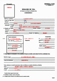 記入は、フランス語もしくは英語でタイプ(ワープロ可)して下さい。手書きのもの、日本語記入は認められませんのでご注意願います。 記入漏れ、スペリングなど間違えの無いように、再度確認してください。 記入方法など、分からないことがありましたら、遠慮なく事務局までご連絡下さい。 ビザ申請には、下記の「ビザ申請書フォーム」をダウンロードしてご使用になれます。(大使館承認済み) ご使用になる場合は、A4版で作製してからスキャンして下さい。
