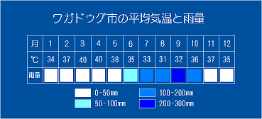 湿気は少ないが、季節によって気温は45℃位まで上がります。外出時は、日射病、熱射病に注意して下さい。飲料水はできる限りミネラルウォーターを飲用します。ワガドゥグ市内の水道水は特に問題はありませんが、極度の水不足になると水が茶色に濁り飲めません。黄熱病・破傷風・B型肝炎の予防接種は必要。
