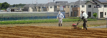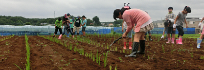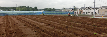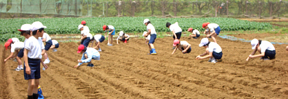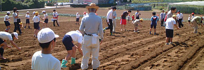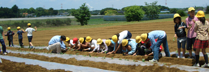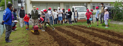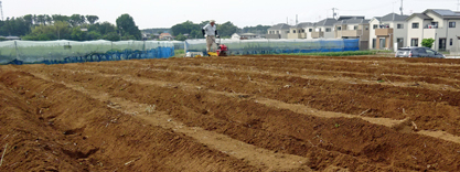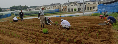 児童たちが畑に来る前に、農家の方々の協力を得て、畝上げを行い、定植の準備完了。