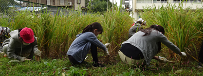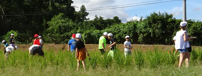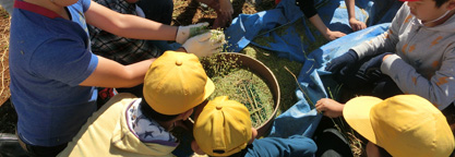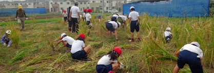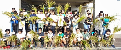稲穂は、まだポツポツと生育はいまいちです。秋晴れの中、児童たちと草取り作業を行いました。
