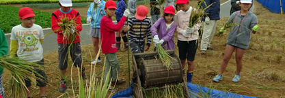 曇天の中、稲刈り、脱穀などの作業を行いました。珍しい体験に、子供たちは大喜びでした。