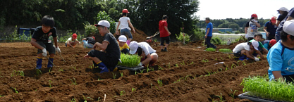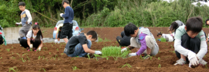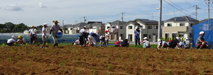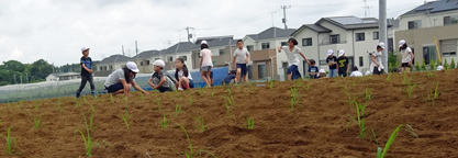 順延になっていた苗の定植。1カ月間小学校で育てた元気な苗を、児童たちと畑に植えました。