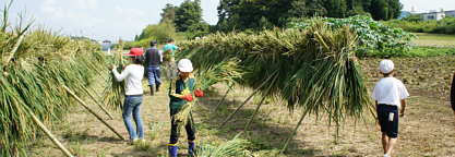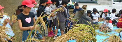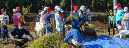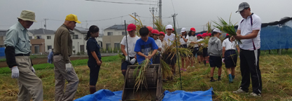 稲刈りと脱穀作業を行いました。台風19号の通過後でしたが、稲はほとんど倒れず残っていました。