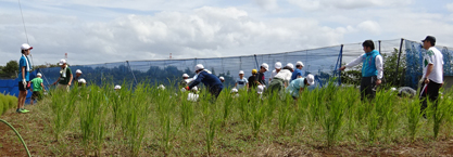 30℃を超す暑さの中、小学校で育てたネリカの苗を、児童たちと共に畑に定植しました。