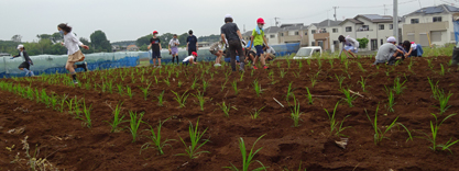 子どもたちと定植を行うための事前準備です。今年は、15本ほどの畝をたてました。