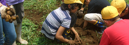 草取り作業後のイモ掘り。収穫したジャガイモはお母さんへのプレゼント。