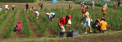 5年生児童49名が参加。耕作面積も増え、ネリカ米の種蒔きやスイカを植えました。