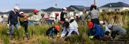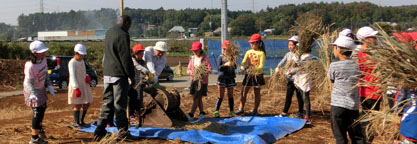 ブルキナファソ大使、白井市長をはじめ108名が参加。収穫したアフリカ米を用いてのブルキナファソ料理、豚汁、餅つきなど、食育を兼ねて食文化の交流を行いました。(読売新聞)