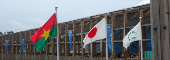 「EXPO 2005 AICHI」開催中、ブルキナファソのサポート(一市町村一国フレンドシップ事業)は江南市が担当しております。グローバル・コモン5の中にあるブルキナファソのブース、毎日平日で約13,000人の見物客が訪れております。