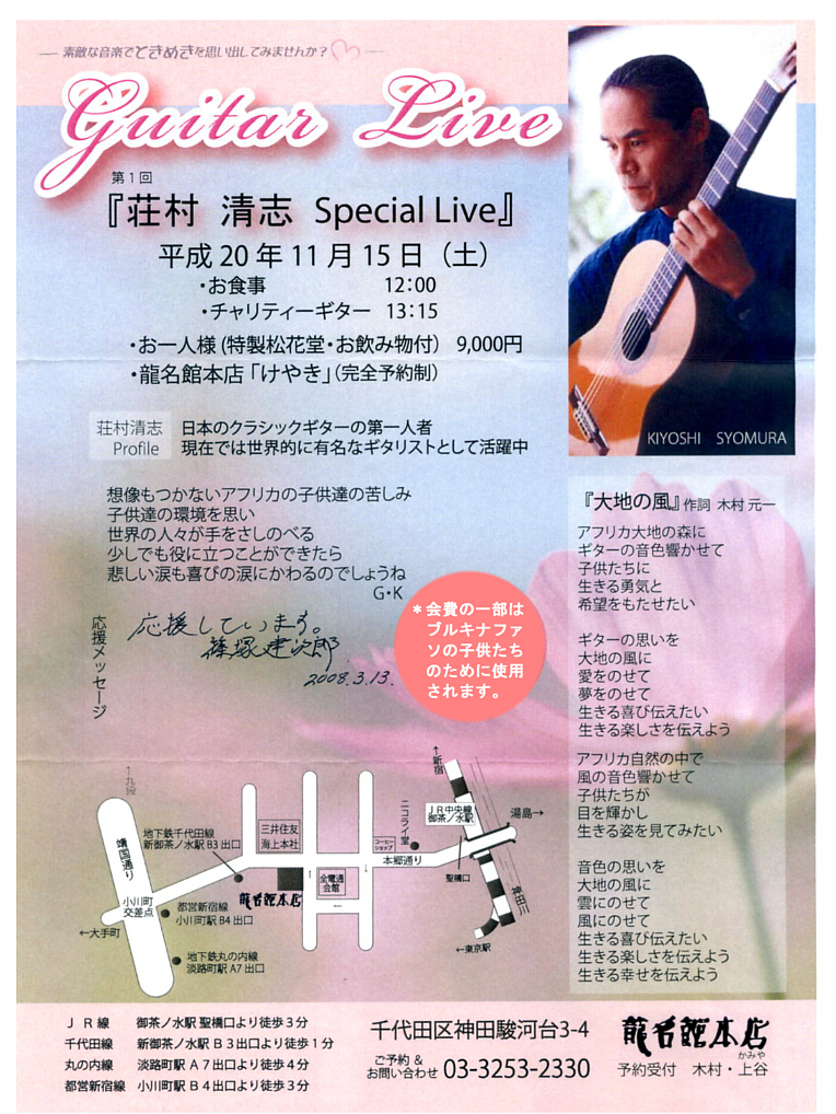 チャリティ「荘村清志 Special Live」が、駿河台にある創業明治32年の龍名館本店において下記の通り開催されます。