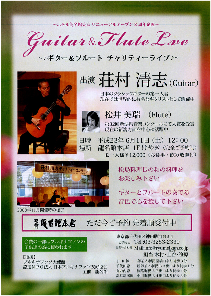荘村氏は世界的に有名なギターリストであり、日本クラシックギターの第一人者でもあります。素敵なギターとフルートの奏でる音色で、心を癒してください。